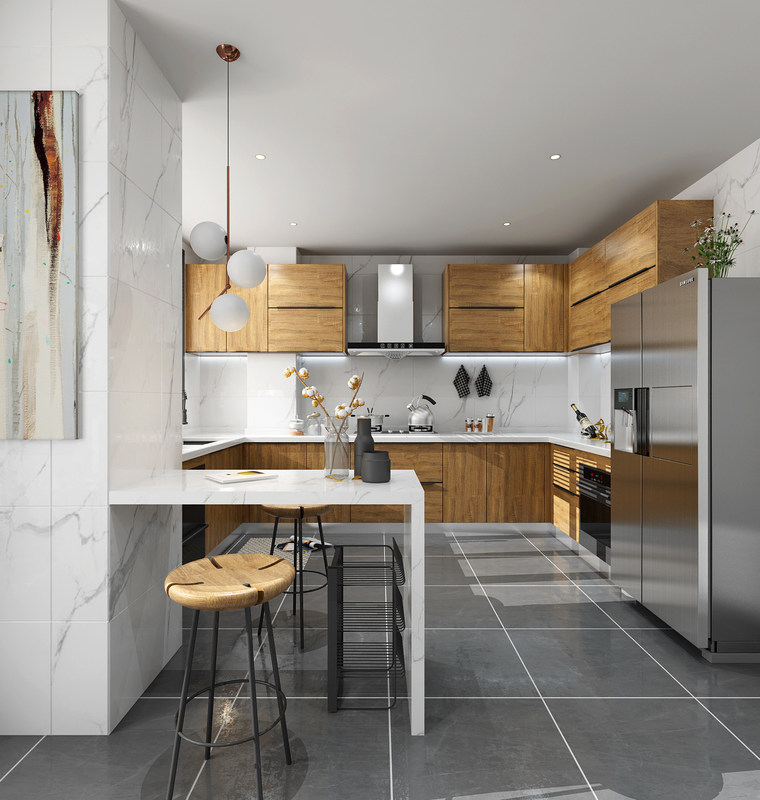 Armários de cozinha de madeira personalizados à prova d'água e de fogo com acabamento automático 4