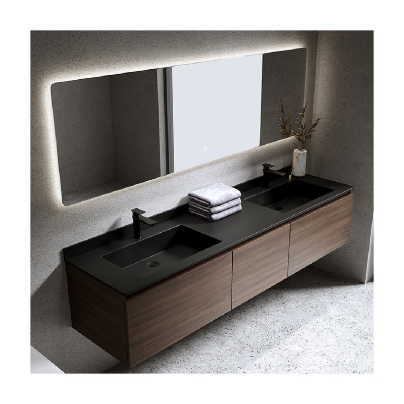 Vanidade de banheiro de estilo moderno de madeira com lavatório duplo com largura e retângulo personalizados 15
