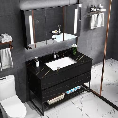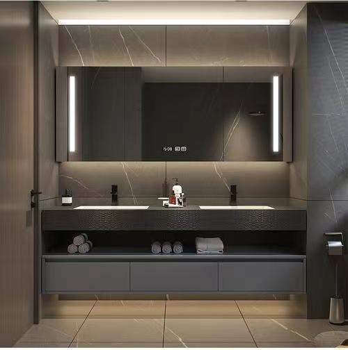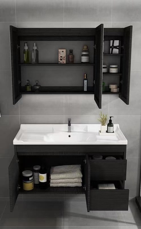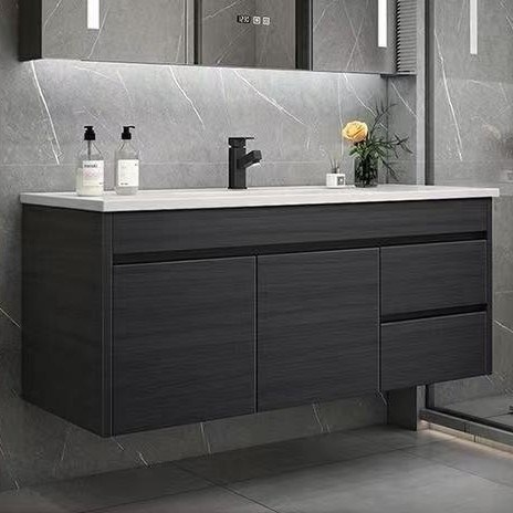 Estilo moderno Alemanha Armários de banheiro de madeira preta e vanidades com lavatório leve 11